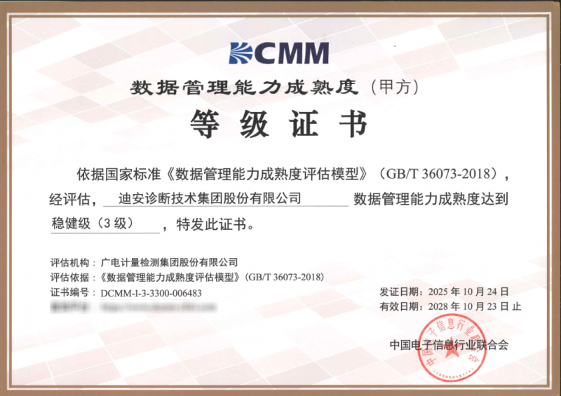在数字化浪潮席卷各行各业的今天,完善的数据治理能力已成为企业的核心竞争力。近日,迪安诊断(300244)顺利通过国家《数据管理能力成熟度评估模型》(GB/T 36073-2018,简称DCMM)稳健级(三级)认证,标志着公司在全域数据管理体系建设领域达到国家高标准要求。这是继2024年获得《数据安全管理成熟度模型》(DSMM)认证后,迪安诊断在数据治理领域的又一重要突破。