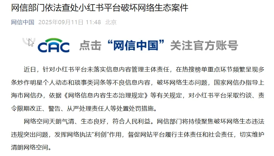9月11日,据网信中国:近日,针对小红书平台未落实信息内容管理主体责任,在热搜榜单重点环节频繁呈现多条炒作明星个人动态和琐事类词条等不良信息内容,破坏网络生态问题,国家网信办指导上海市网信办,依据《网络信息内容生态治理规定》等有关规定,对小红书平台采取约谈、责令限期改正、警告、从严处理责任人等处置处罚措施。