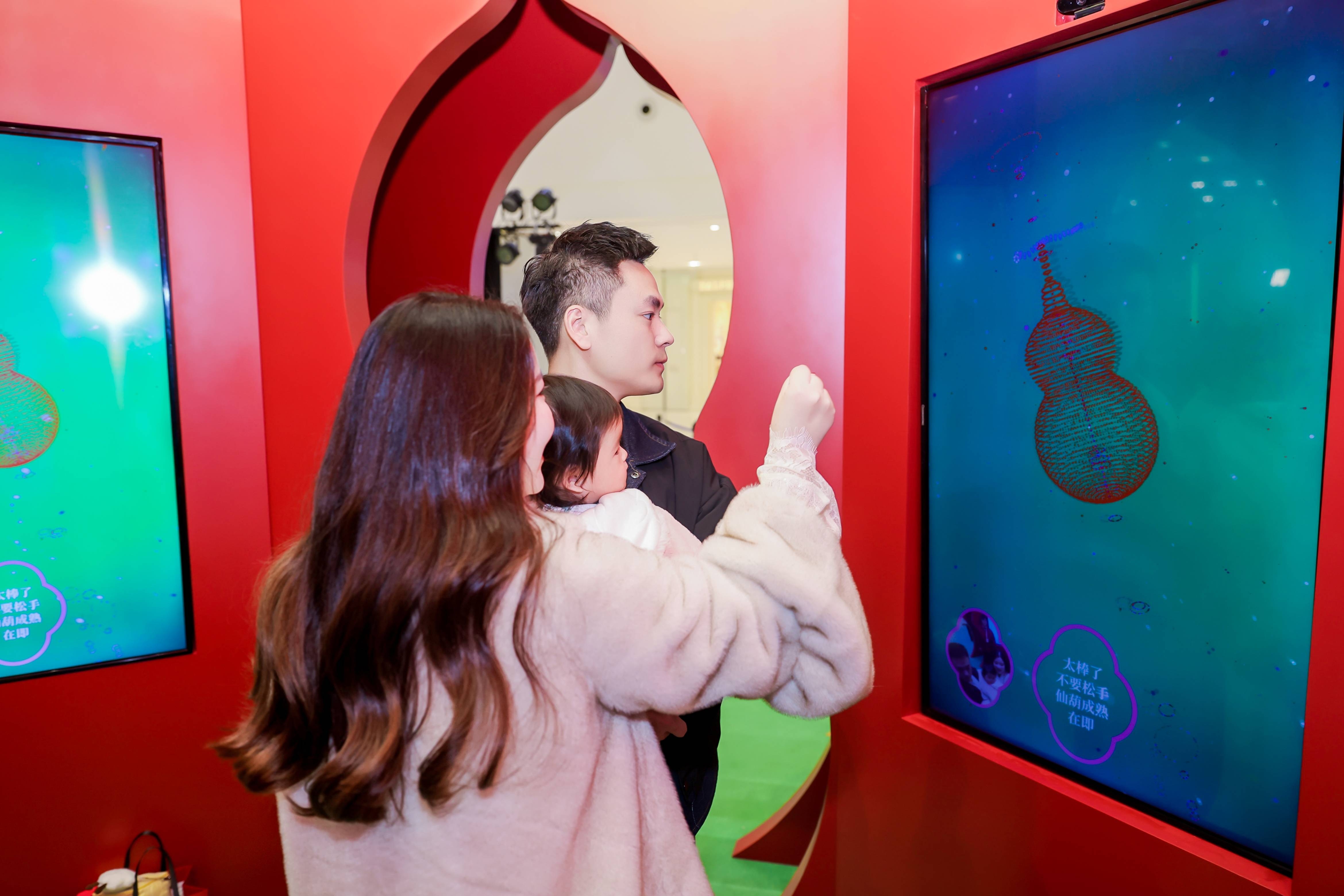 山水,并非远行才可得见。书法水墨艺术家刘玥首展作品《春山行远图》以20米巨幅“山水开卷”,步入其中,与天地春意从容照面;红色的帷幔落于银色的松枝上,就像于山间松下静谧的一隅,“幕下栖心”将是绝佳开年时尚大片的打卡处;松下银椅,为你与挚友“漫叙往来”的相聚时刻营造出宁静、松弛的氛围;多宝阁中陈列着未经雕琢的茶器素胚与场内品牌万仟堂,长沙尼依格罗酒店及tea'stone带来的新春茶器,以“初芒蕴能”诠释着未来的无限可能与新生力量。转身与“莳光种愿” 四方亭相遇。葫芦门朝四方而开,寓意着纳四方福禄,步入其中,与数字交互艺术家吴旭首展作品《无限福禄》体验互动,跟随指引挥动手势,触发粒子凝聚为动态“福”字,亲手完成一场新春祈福仪式。我们把象征团圆与喜悦的红色沙发打造“盏间聚暖”,如怀抱般围合的布局作为“归处”的隐喻。与家人团聚便是心归处,这将是中国年最圆满的意象。