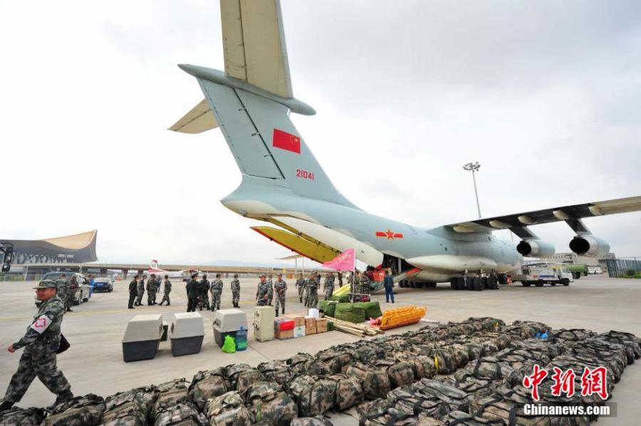 中国空军伊尔-76运输机在昆明长水国际机场装载救灾物资(5月3日摄)。从5月5日起,中国空军再次派出6架伊尔-76飞机,空运中国政府向尼泊尔紧急援助的第二批人道主义救灾物资。