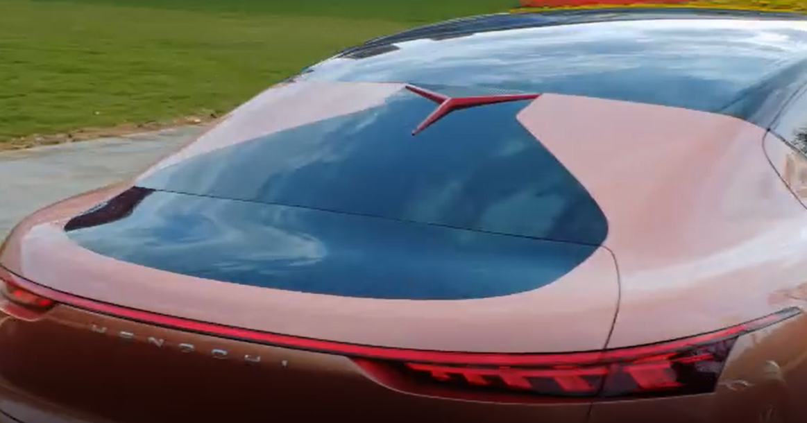 车尾部分,并没有采用掀背的造型设计,但使用了创新的设计理念,将后风挡玻璃和后尾厢部分融为一体。细长的尾灯搭配极具设计感的灯腔内部造型,科技感十足。“HENGCHI”的品牌全拼标致则被放置在了贯穿尾灯下方。