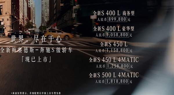 日前,和讯汽车从从奔驰方面获悉,奔驰全新一代S级(W/V223)轿车正式在国内上市,新车共推出5款车型,售价区间为89.98-181.88万元。