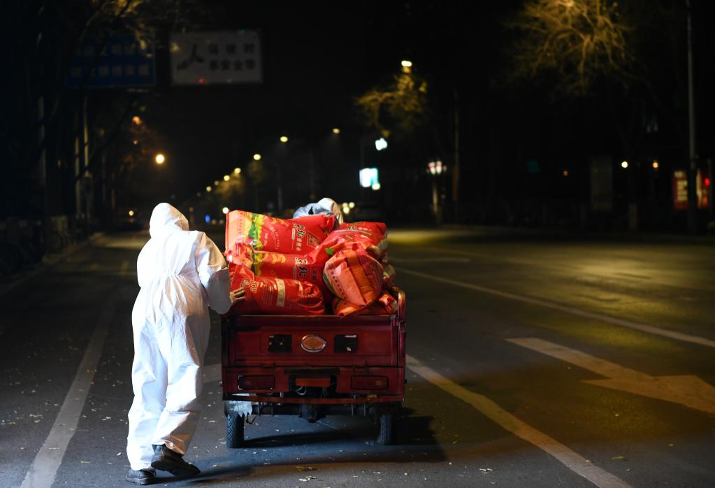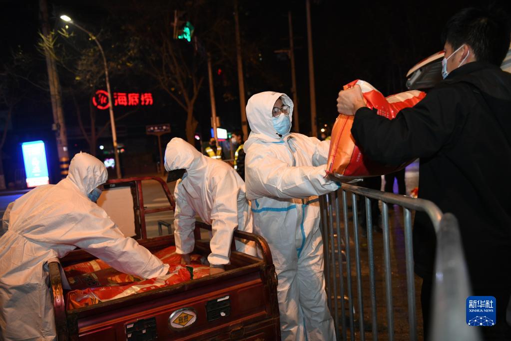 12月22日晚,陕西省石油化工学校工作人员在隔离栏处转运大米。新华社记者 李一博 摄