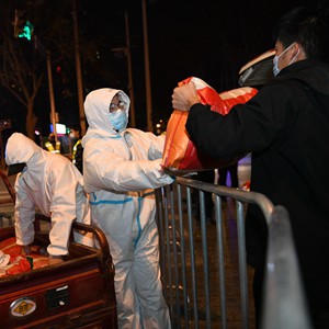 夜色渐浓,22日晚10点多,西安大大小小的街道上行人越来越稀少。雁塔区雁南一路路口,陕西省石油化工学校的工作人员正隔着围栏接过一袋袋大米。“再往里是封控区域,车辆没办法进入,只能靠小推车运进去。最主要是保障学校餐厅的运转。”工作人员孙洋说,隔着防护服,他和任何一个“大白”几乎看不出区别,只有声音显得很年轻。