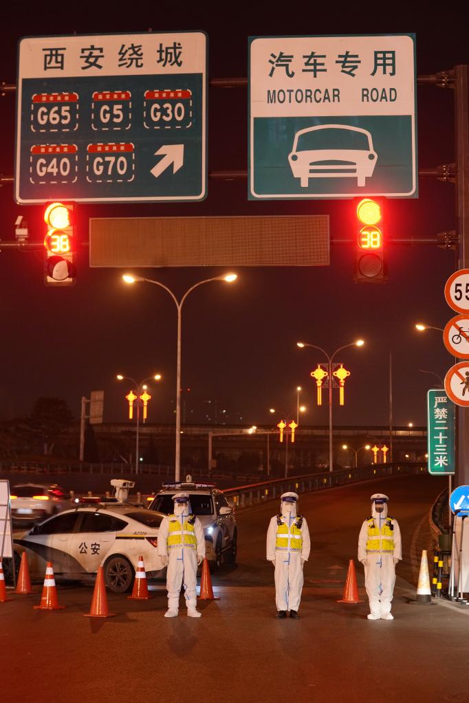 12月22日晚,交警在西安绕城高速长安路入口处执勤。新华社记者 李一博 摄