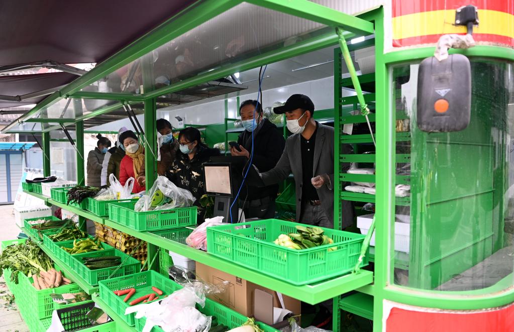 12月23日,西安市曲江新区曲池坊小区内引入蔬菜大棚车,供住户在小区内买菜。新华社记者 刘潇 摄