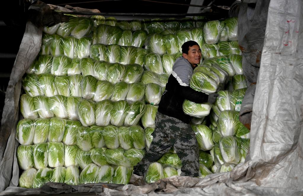 12月19日,西安西部欣桥农产品物流中心内,工人正在搬运蔬菜。新华社记者 刘潇 摄