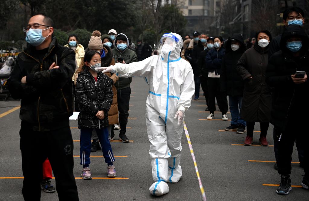 12月23日,西安市新城区碧翠锦华社区内,核酸检测人员在维持秩序。新华社记者 刘潇 摄