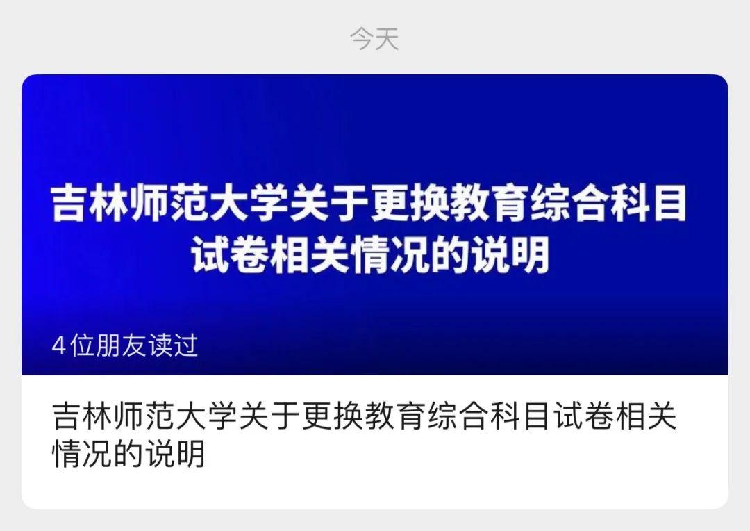 根据媒体此前报道,12月26日,网传吉林师范大学专业科目333教育综合,在开考40分钟后临时换卷,考生不得不重新答题,考试也因此延迟交卷。此事引发公众关注。