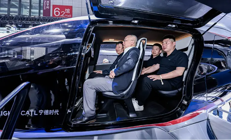 在宁德时代展台中央,搭载其高性能电池的峰飞航空2吨级eVTOL航空器重磅登场,极具未来感的造型吸引全球参展商和众多商业大咖试乘打卡,吸睛无数。