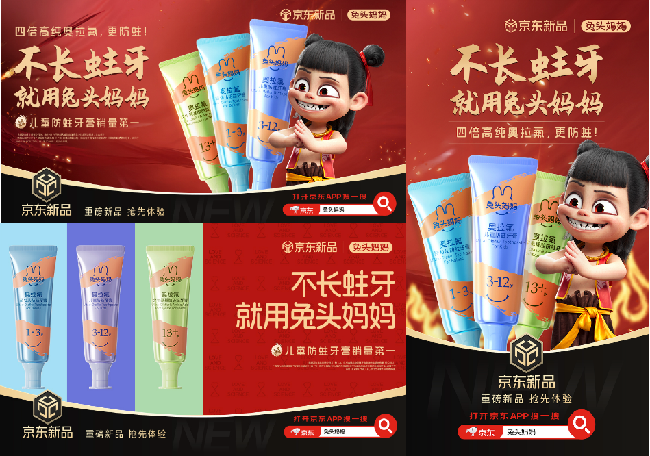 2024年,兔头妈妈集中攻克技术壁垒。三年时间,先后攻克了检测方法、组分表征、性能表征、安全评估和制备方法等多个方面,首次打开奥拉氟科技的“黑匣子”,并实现全面超越。兔头妈妈以“全球领先,中国方案”为沟通主题,将自身在儿童防蛀领域的自主研发科技,与哪吒所代表的“反抗命运、自我革新”精神进行创造性结合,完成了一次从“卖产品”到“讲故事”、从“推功能”到“传价值”的品牌升维。