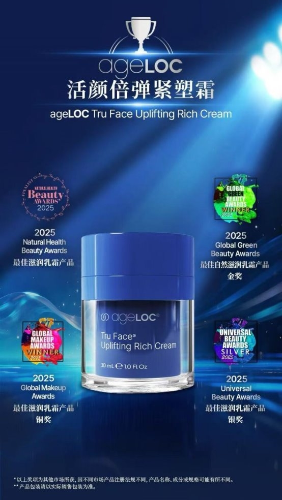 欧睿国际最新调研数据显示,如新是 2023 和 2024 连续两年全球零售额第一的美容与健康仪器系列公司(数据源自 Euromonitor International Limited;按 2023 和 2024 全球各公司居家美容与健康仪器系列整体零售渠道零售额,不包含美容院线服务,于 2025 年 7 月完成调研),彰显了其在仪器护肤领域的全球领先地位。在 2025 Global Makeup Awards(2025年度全球化妆大奖*)评选中,如新产品凭借出众的产品力在近十个品类中脱颖而出,收获多项重磅奖项:ageLOC Tru Face Refining Toner(活颜精萃水)荣获最佳护肤产品银奖*;ageLOC Tru Face Uplifting Rich Cream(活颜倍弹紧塑霜)与ageLOC Tru Face Essence Ultra(活颜倍弹源液)分别斩获最佳滋润乳霜产品铜奖及最佳精华产品银奖*。近期推出的超光谱智能扫描仪 Prysm iO 荣获 2025 年度 Blobee Business Awards 年度创新产品银奖*。