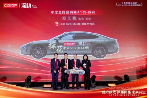 大会对过去一年逆势增长、表现卓越的标杆经销商予以隆重表彰。其中,大自然家居集团董事会主席、集团总裁(CEO)佘学彬、集团董事会副主席袁顺意,携手仰望汽车总经理 胡晓庆,共同为“年度金牌经销商”颁发仰望U8L,以榜样力量激发全域“向赢而战”的奋斗激情。