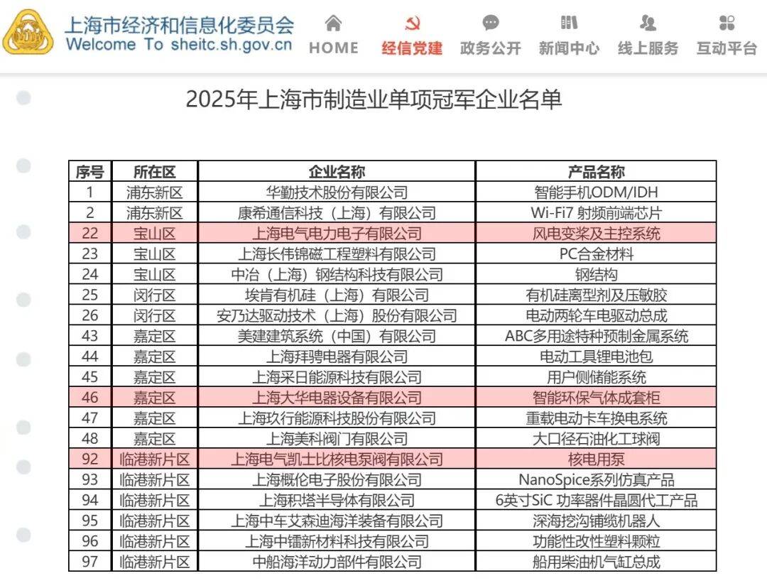 上海市经信委日前公布2025年“上海市制造业单项冠军企业”名单,上海电气(601727)旗下上海电气凯士比核电泵阀有限公司、上海电气电力电子有限公司、上海大华电器设备有限公司三家企业成功上榜。