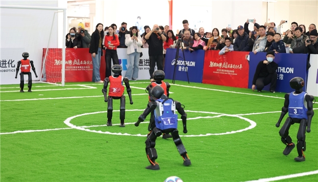 去年火出圈的机器人足球赛今年重磅升级,从2V2变为3V3。加速进化机器人全程AI自主决策,传球、抢断、射门行云流水;更刺激的是新增了人机点球大战。迪卡侬全面助赛,提供教练解说以及运动装备,为传统庙会增添一抹动感与现代气息,与市民共度一个充满活力的“科技运动年”。