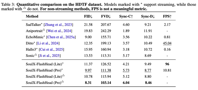 对比今年1月开源的 SoulX-FlashTalk,SoulX-FlashHead实现了场景突破。前者以0.87s亚秒级超低延时、32FPS高帧率与支持超长视频稳定生成,验证了实时数字人的可行性。后者则进一步将高保真能力下沉到个人工作站,使相关技术从集中算力环境走向更广泛的使用场景。
