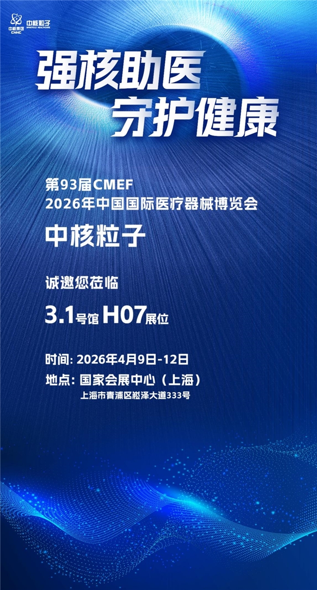 春申启幕,医械汇潮。2026年4月9-12日,全球医疗行业年度盛典——第93届中国国际医疗器械博览会(CMEF)在上海国家会展中心盛大举行。本届展会以“创新科技 智领未来”为核心主题,汇聚全球30余个国家和地区的近5000家企业,搭建起覆盖医疗器械全产业链的顶级交流平台。作为中核集团重大核医疗装备自主创新产业平台,中核粒子医疗科技有限公司(以下简称“中核粒子”)携核医学影像、放射治疗、硼中子俘获治疗三大核心产品线的最新自主创新成果重磅亮相。