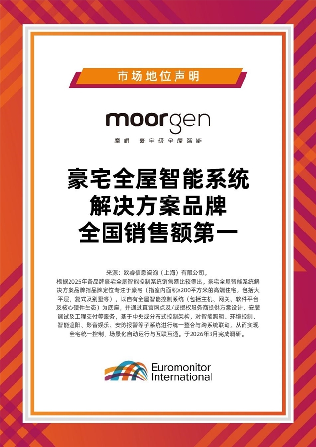 2026年3月,国际调研机构欧睿国际授予摩根“豪宅全屋智能系统解决方案品牌全国销售额领先”的认证。这一认证基于真实市场销售数据的调研,从市场表现、产品落地、用户认可等多维度,客观印证摩根在高端全屋智能领域的领先地位。