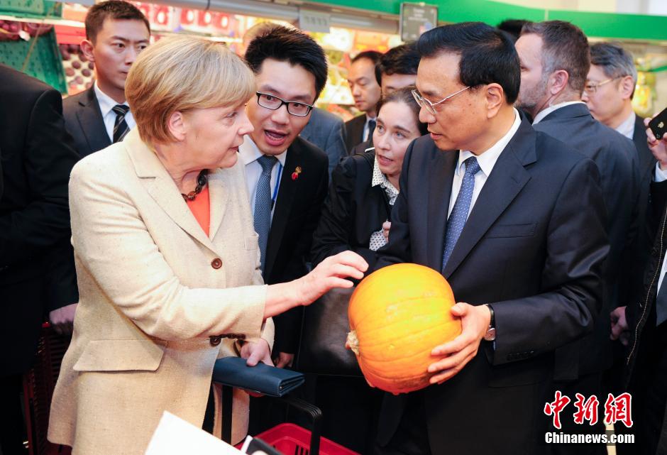 组图:默克尔同李克强在柏林逛超市 推荐寄明信片给家人