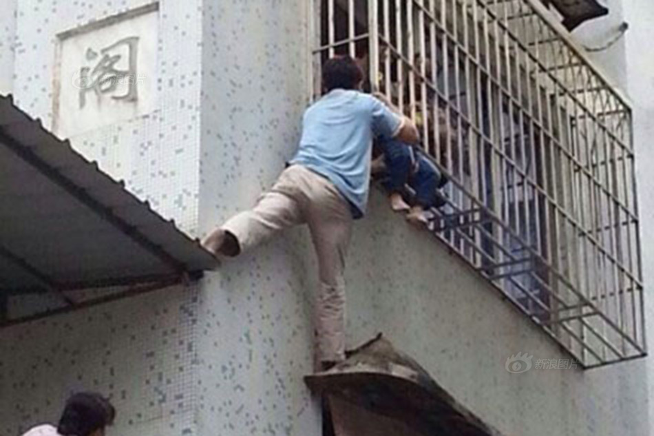 组图:福州5岁男孩卡在三楼 遇“托举哥”获救