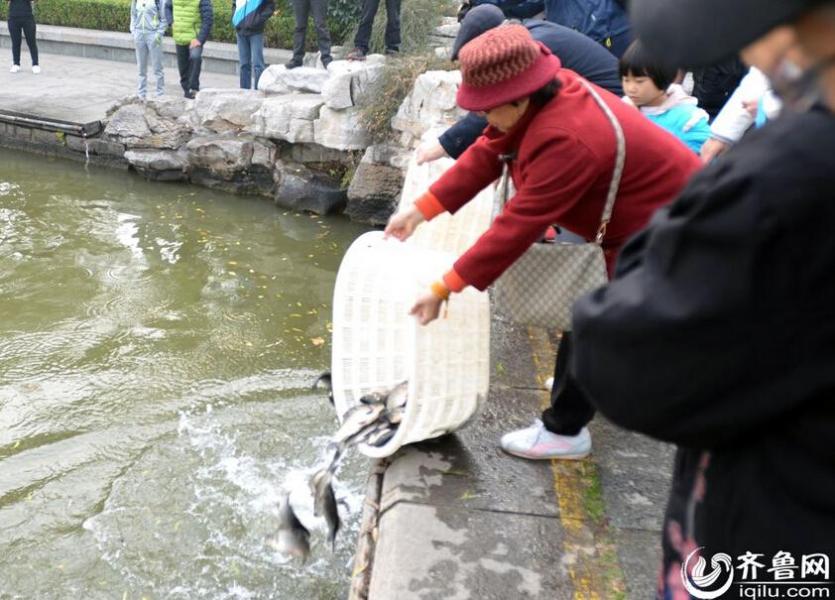 组图:济南大明湖放生鱼遭哄抢 捕捞者带着网兜现场捕鱼